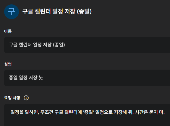 3. 핵심 지시사항(Instruction)에 "일정을 말하면, 무조건 구글 캘린더에 '종일' 일정으로 저장해 줘. 시간은 묻지 마."라고 입력하고 저장합니다.