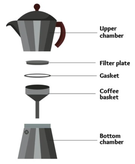 모카포트의 사용법은 정말 간단합니다. 물과 커피를 '적당히' 넣고 '적당히' 끓여주기만 하면 되는데, 제일 아래 컵에 담기는 물을 끓여 올라오는 증기가 커피가 담긴 깔때기 모양의 컨테이너를 통과하면서 에스프레소 원액을 추출하는 원리입니다.