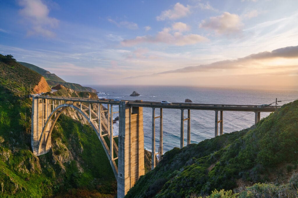 빅스비 브리지(Bixby Bridge)는 빅서(Big Sur)에서 북쪽으로 불과 15분 거리에 있는 상징적인 명소입니다. 세계에서 가장 높은 다리 중에 하나이고 미학적 디자인과 위치 때문에 태평양 연안에서 가장 멋진 경치 중에 하나입니다