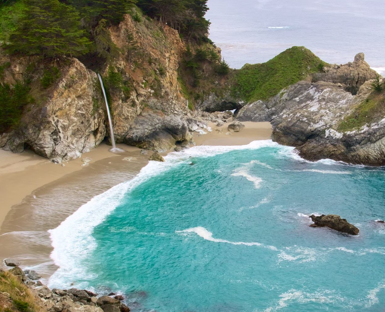 McWay Falls는 위의 사진에서 본 것처럼 해변과 바다로 직접 흐르는 유명한 폭포입니다. 정말 아름다운 광경이며 빅서(Big Sur)의 주요 명소 중 하나입니다. 실제로 폭포를 가까이서 보기 위해 해변으로 내려갈 수는 없지만, 1번 국도변의 전망대에서는 폭포와 만의 아름다운 풍경을 감상할 수 있습니다. 조수에 따라 폭포가 바다로 흘러내리거나 해변으로 쏟아져 나옵니다.