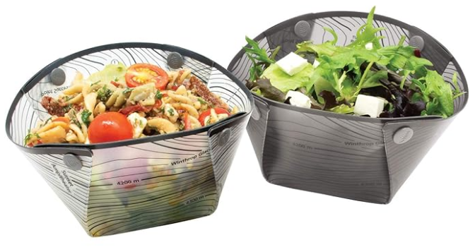 종이처럼 평평하게 펼쳐서 보관하고 사용 시 조립하여 그릇이나 사발처럼 이용하는 인체에 무해한 얇은 플라스틱 용기입니다. 무게가 40g에 불과한 초경량이며 사용 후 세척이 쉽습니다. 환경을 살리는 일회용품의 훌륭한 대안입니다.