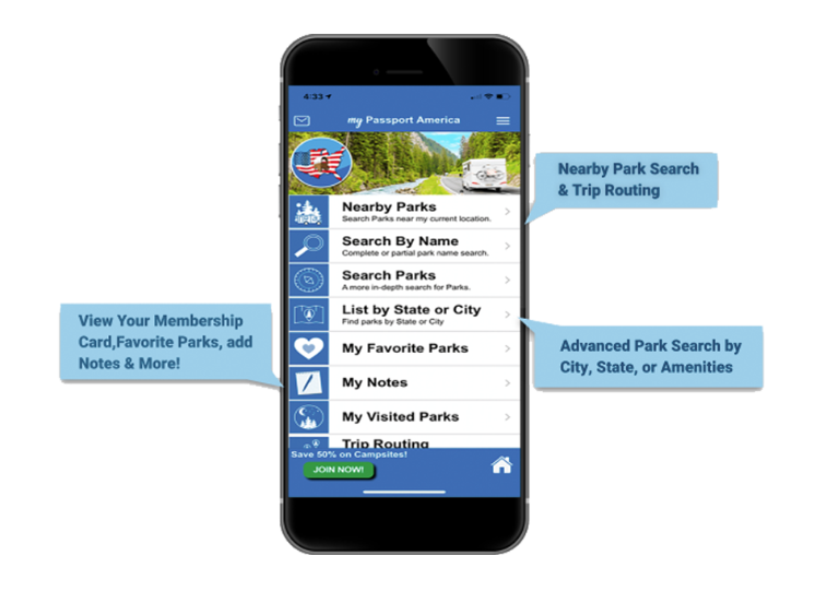 "My Passport America" 앱을 사용하면 참여 캠프장을 쉽게 찾고, 리뷰를 읽고, 경로를 계획할 수 있습니다. 이는 이동이 잦은 여행자에게 특히 유용합니다.