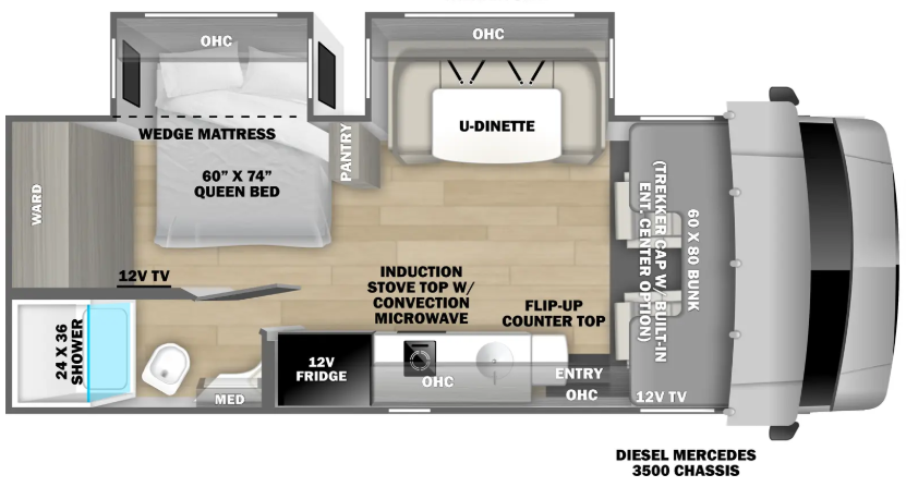 • 오버헤드 벙크 베드 – 운전석 위쪽에 추가 침대 공간 제공