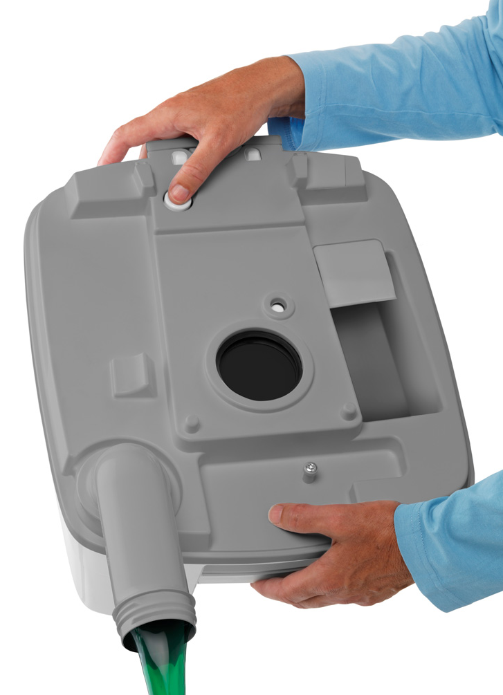 변기 위에 있는 버튼을 옆으로 이동시키고 위로 살짝 들면 청수통과 오수통이 분리됩니다. 오수통에 연결된 파이프 라인을 앞으로 돌리고 뚜껑을 열어 변기에 배설물을 버리면 됩니다.